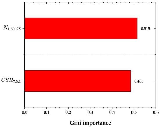 Feature importance in the isotonic-calibrated RF model was assessed using the Gini impurity metric [], which evaluates each predictor’s contribution to the overall decision process by measuring the reduction in node impurity across all trees. As shown in Figure 6, N1,60,CS appears to be the most influential variable, with a Gini importance of 0.515. Meanwhile, CSR7.5,1 is close behind at 0.485. This distribution highlights the similar but slightly different roles of in situ soil resistance and seismic demand in distinguishing liquefaction outcomes, consistent with established geotechnical principles, where penetration resistance often indicates susceptibility under specific loading conditions [].