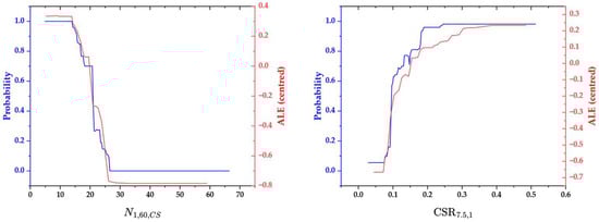 The PDPs and ALEs further clarify these dynamics (Figure 7). For N1,60,CS, both the PDP and ALE profiles show a nonlinear decrease in Pliq, dropping sharply from nearly 1.0 below 10 to almost 0 above 30, indicating a threshold-like transition around 15–25. It follows that small increases in resistance can result in substantial reductions in risk. The centered ALEs highlight local variations, showing strong adverse effects in this mid-range, which indicates that engineering interventions, such as ground improvement, could be most effective here. In contrast, CSR7.5,1 displays a sharp sigmoid-shaped increase, with the probability rising from minimal levels below 0.1 to nearly certain above 0.3, and ALE positive deviations peaking at 0.15–0.25, pointing to a sensitive zone where site-specific seismic analyses are essential.