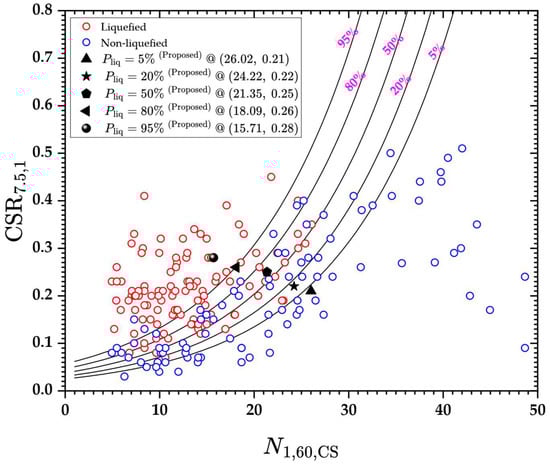 Figure 9 overlays the proposed median thresholds (black markers) on the redrawn contours from Cetin et al. []. A visual inspection shows a close agreement in the mid-probability range. For Pliq = 50%, the point at N1,60,CS = 21.35 and CSR7.5,1 = 0.25 sits close to the median contour (CSR7.5,1 ≈ 0.22). The +14% CSR7.5,1 difference yields an implied FS of 0.94, comfortably within the standard design parameters’ tolerance.