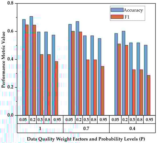 Validation utilized a separate 20% hold-out test set (n = 42) that was entirely independent of all training, calibration, and threshold-setting steps []. Observation weights based on data quality classes (A = 1.0, B = 0.70, C = 0.40) were maintained to ensure consistency in penalizing misclassifications. Performance was assessed using a weighted confusion matrix, from which accuracy, precision, recall, and the F1 score were calculated []. A sensitivity analysis then evaluated the robustness of the rule to different weight assumptions by uniformly rescaling the weights for Classes B and C, while keeping the thresholds fixed. This analysis demonstrated how changing the importance of lower-quality records influences predictive performance without altering the current decision criteria.