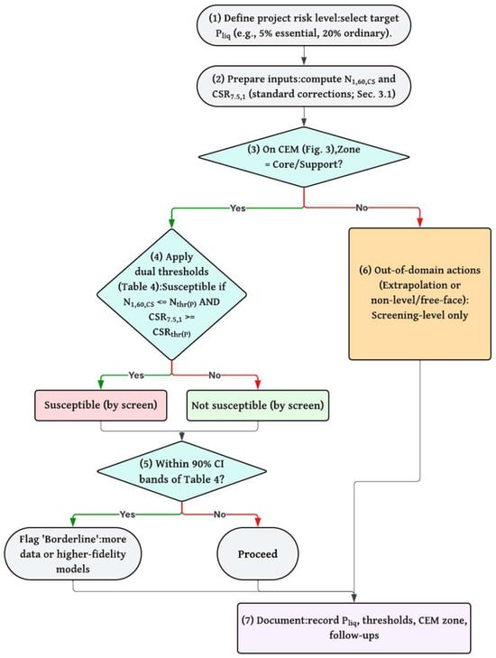 The proposed dual-threshold framework provides significant practical value for geotechnical and structural engineers involved in seismic building design. It provides a streamlined, risk-calibrated tool that easily integrates into performance-based workflows. By simplifying complex RF predictions into straightforward cutoff pairs for N1,60,CS and CSR7.5,1 across five probability levels (Table 4), the rule enables rapid preliminary screenings: a site is considered susceptible if resistance drops below the N1,60,CS threshold and demand exceeds the CSR7.5,1 threshold. Such streamlining enables rapid identification of liquefaction hazards without the need for extensive probabilistic calculations. The simplicity addresses a significant obstacle in adopting ML models, as highlighted in the literature, where black box outputs often discourage routine use []. Engineers can select thresholds based on project importance; for example, Pliq = 5% (implied FS ≈ 1.67) for critical facilities, such as hospitals, ensuring conservative margins in line with codes, such as that of the American Society of Civil Engineers (ASCE 7), which require FS > 1.2–1.5. Alternatively, Pliq = 20% (FS ≈ 1.37) can be used for ordinary structures to strike a balance between cost and safety. When the simplified assumptions for rd, site amplification, or MSF are questionable (for example, in deep soft basins or where there are significant impedance contrasts), CSR should be obtained from site-specific 1D/2D response or effective-stress dynamic analyses and then normalized to CSR7.5,1 before applying the screening rule. Recommended use cases include initial screening and design reviews for standard and critical building facilities where SPT data is the primary source and where site conditions fall within the Core/Support domain described in Section 3.7. Projects requiring higher accuracy or involving complex geology, such as essential facilities, layered or sloped sites, unusual grain sizes or plasticity, or strong static shear, should combine the rule with expanded feature sets or CPT-/Vs-based probabilistic models and, when appropriate, implement site-specific effective-stress analyses. For projects located in basins or depositional settings that are underrepresented in the training catalog, the screening results should be confirmed with an external dataset from a recent regional event (e.g., 2023 Turkey–Syria) before making final design decisions. Regional transfer can be assessed by freezing the learner and recomputing the isotonic probability mapping and bootstrap thresholds with locally sourced cases. If such calibration is not performed, outcomes should be considered screening-level, and reporting the geologic context provides traceability. For daily use, Figure 11 offers a step-by-step flowchart outlining the screening process: Pliq selection, input preparation, CEM coverage check, dual-threshold test, confidence-band check, out-of-domain actions, and documentation.