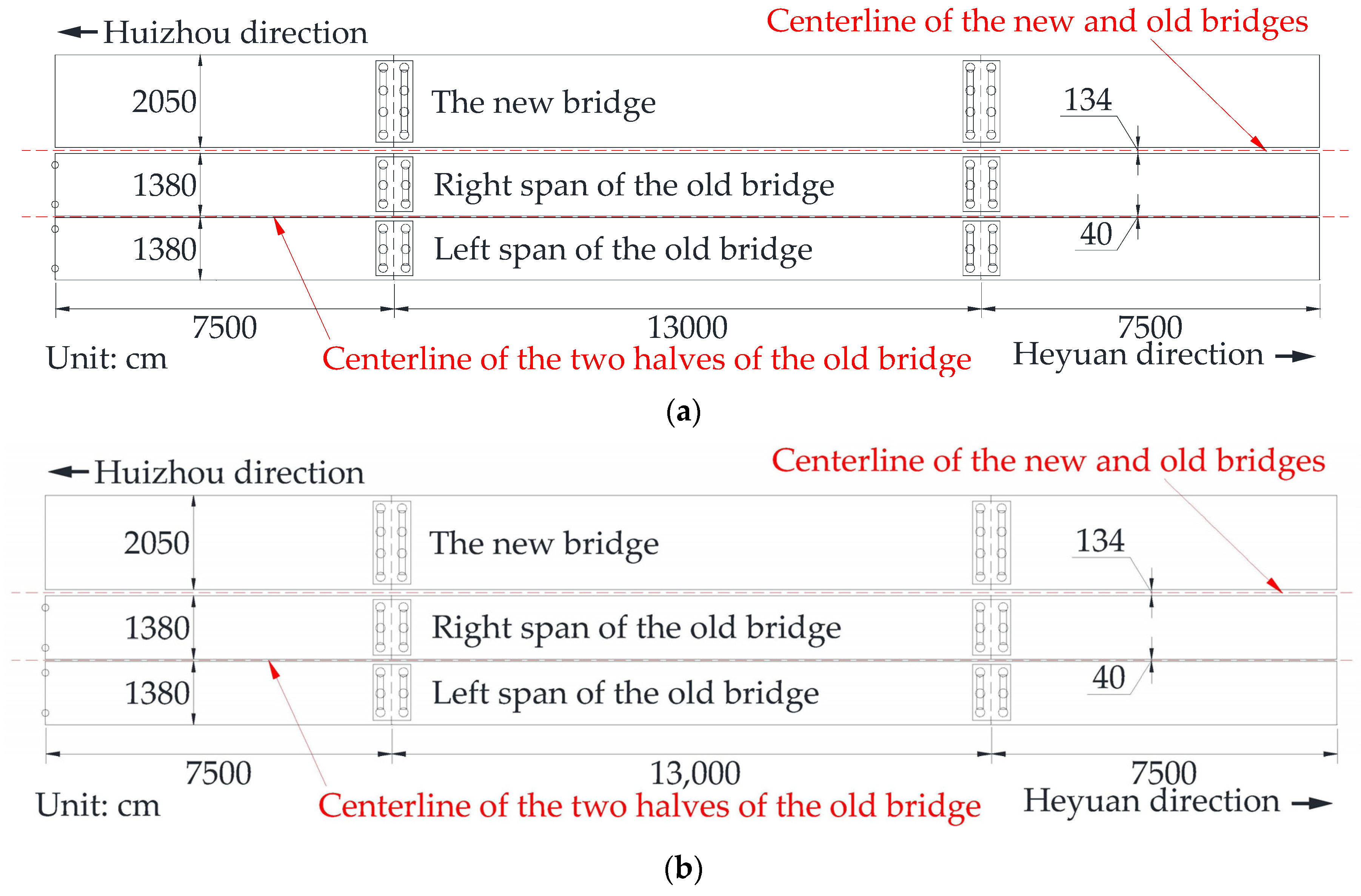 Differential deformations between the old and new bridges and between two separate spans of the old bridge are monitored in this test. The arrangement scheme between the old and new bridges is presented in