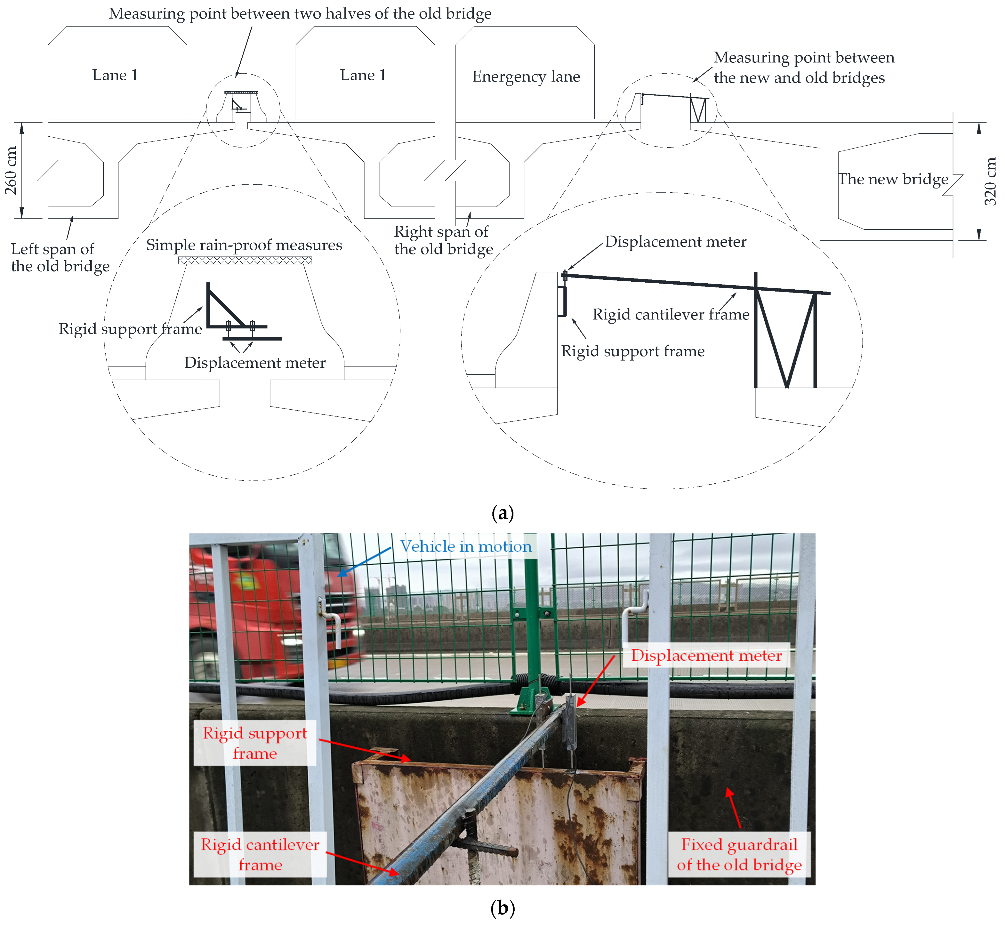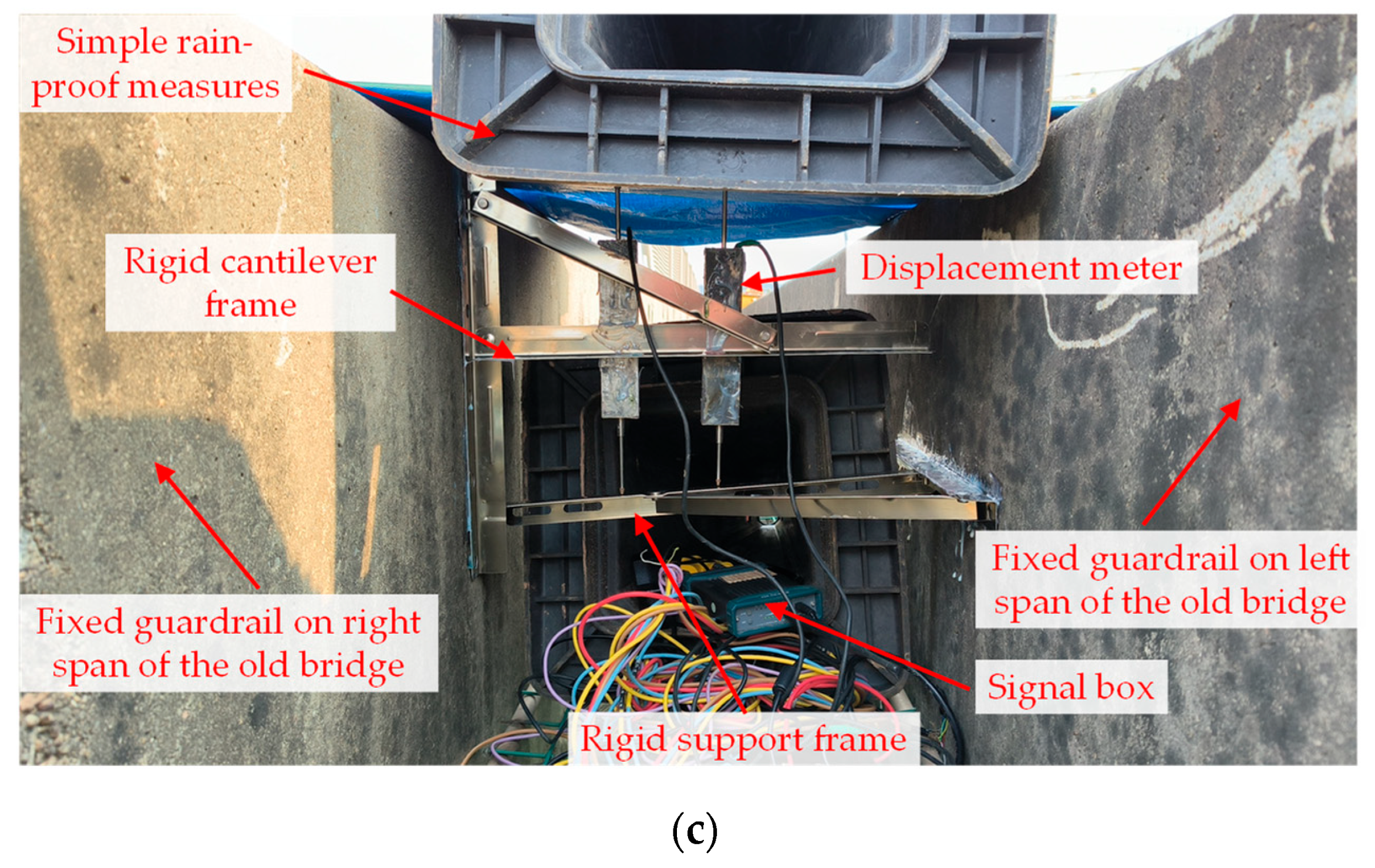 Figure 7c. At this position, a set of rigid support frames with displacement meters is arranged between adjacent guardrails of the old bridge. The deformation obtained can represent the deformation difference between the two separate spans of the old bridge.