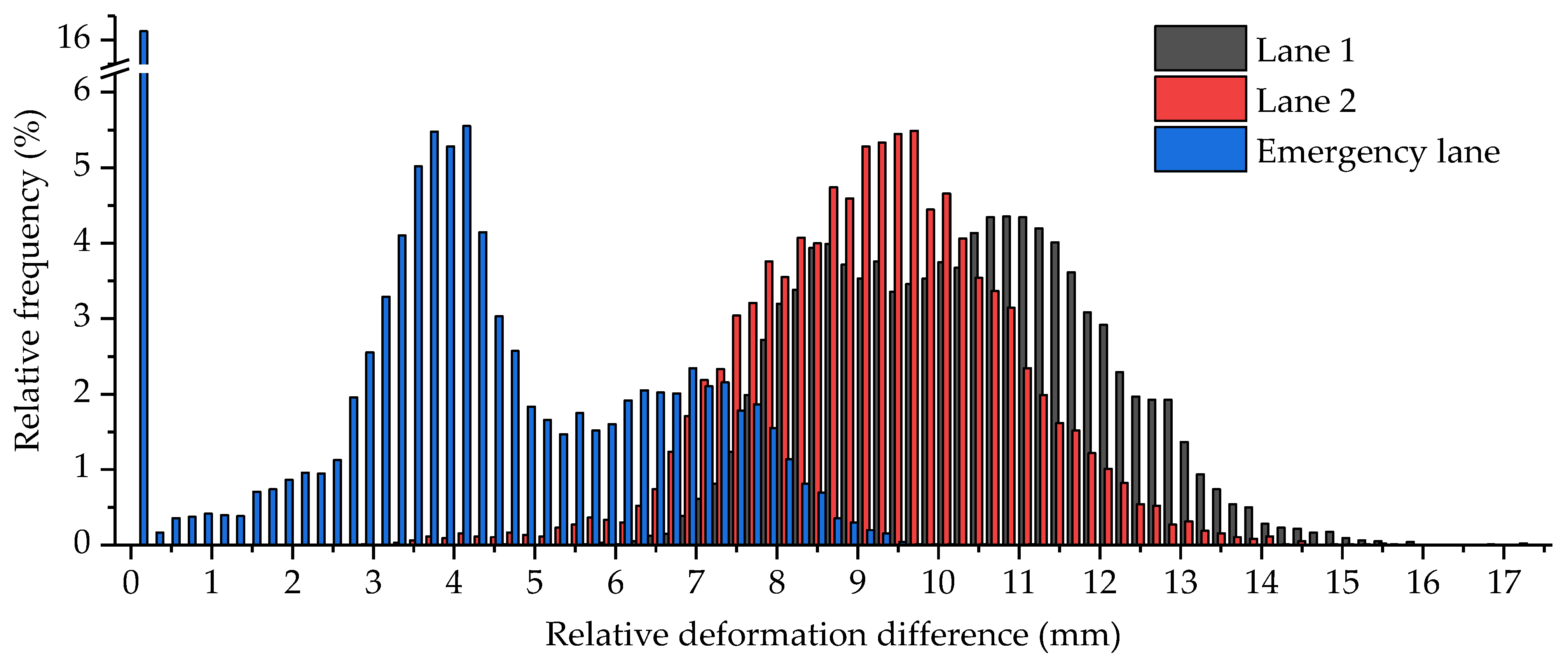 Figure 9. It can be seen from the statistical results that the random traffic flow on the emergency lane will not produce obvious displacement effects in most cases. In the case of the existing splicing deformation difference, the mean and peak values are about 4.1 mm and 9.6 mm, respectively. The mean values caused by random traffic flow on lanes 1 and 2 are about 9.7 mm and 10.9 mm, respectively. The peak values on lanes 1 and 2 are about 14.5 mm and 15.8 mm.
