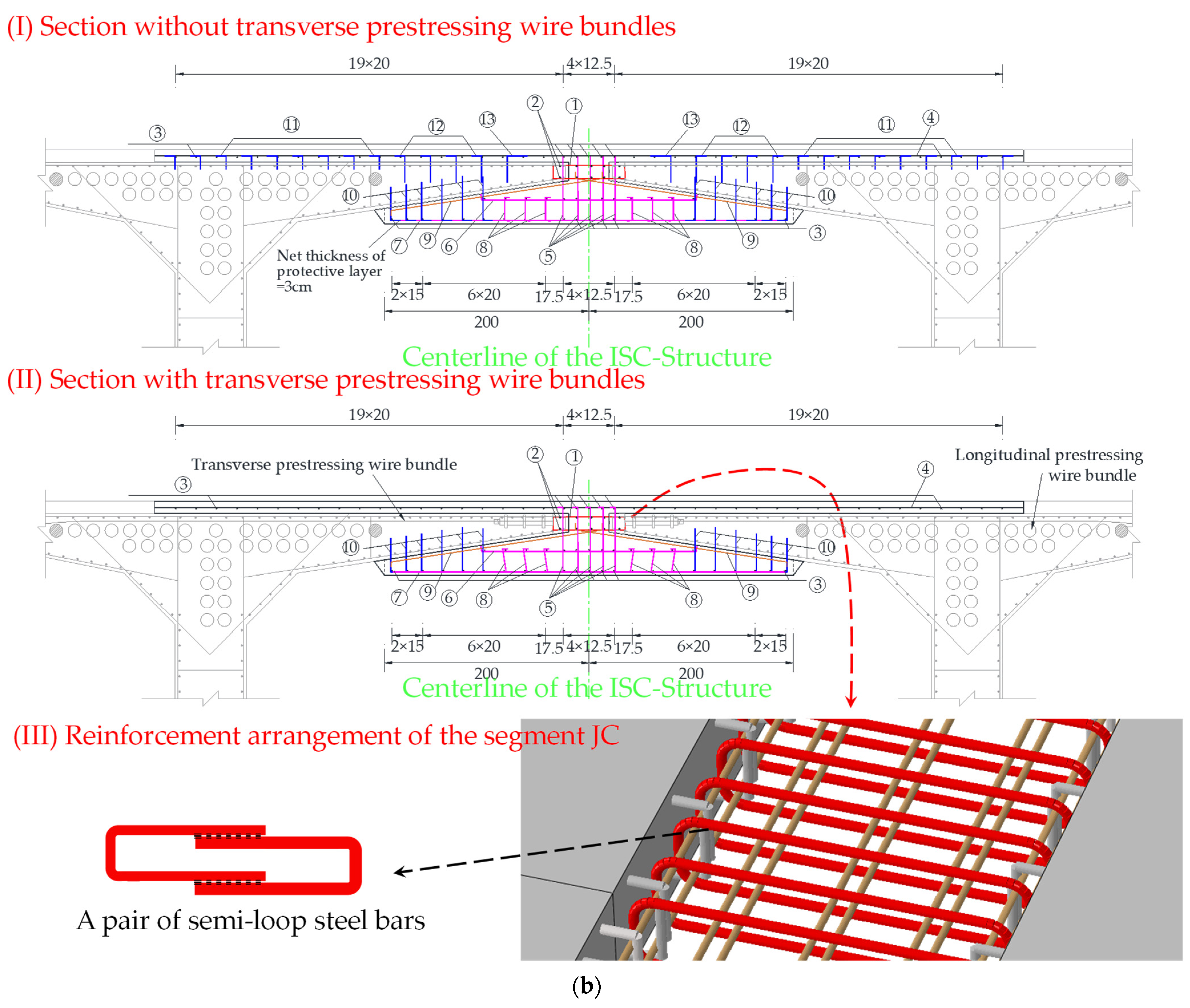 A complete loop bar is formed in the segment JC using a pair of semi-loop reinforcement bars. It is connected to the longitudinal steel bar to form a reinforcement frame in this segment. It is also connected with the steel bar retained at the end of the flange plate after concrete chiseling so that the reinforcement of the flange plate of the old bridge and that of Segment JC can form a whole frame.