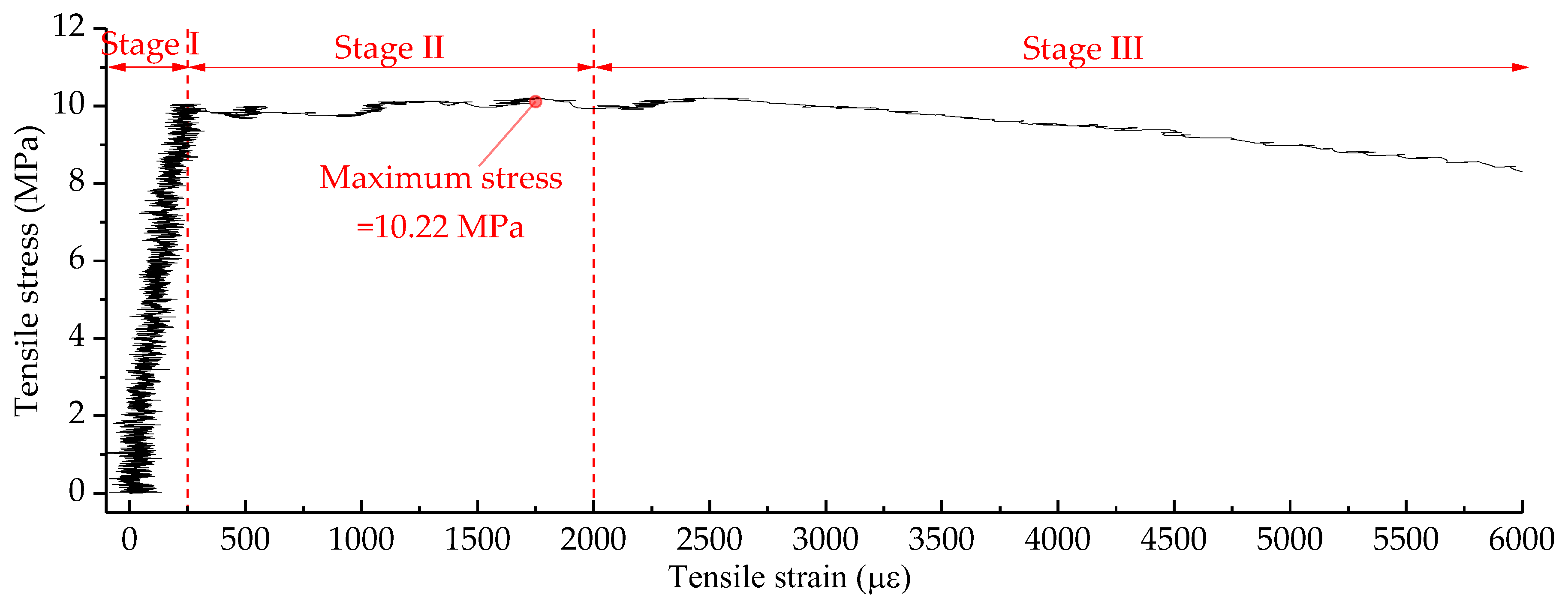Stage II: The tensile stress increases slowly, while the strain increases quickly. When the tensile strain reaches its ultimate value, the tensile stress has also reached the maximum value.