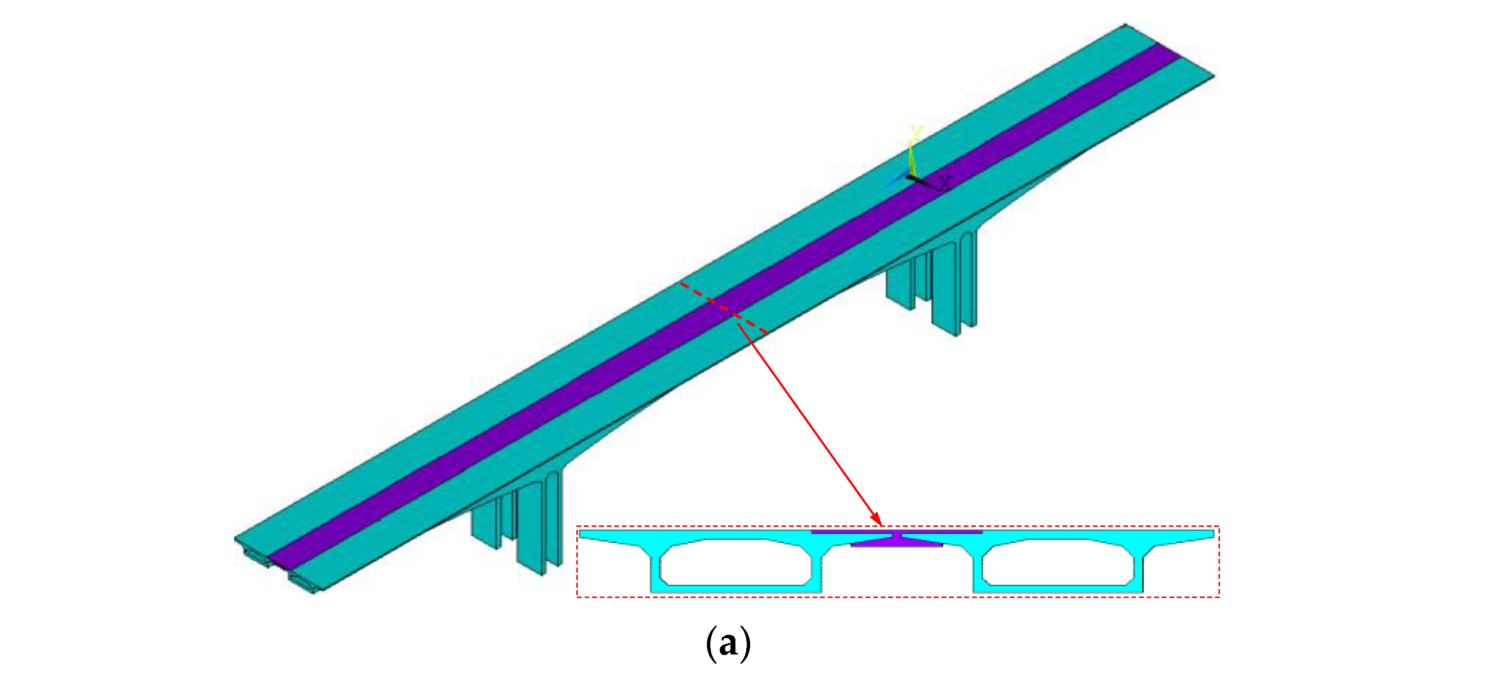 The mid-span section of the second span was selected as the key section for analysis, which represents the maximum positive flexural moment condition of the middle span. A 3D simulation model of the old bridge was established, as shown in