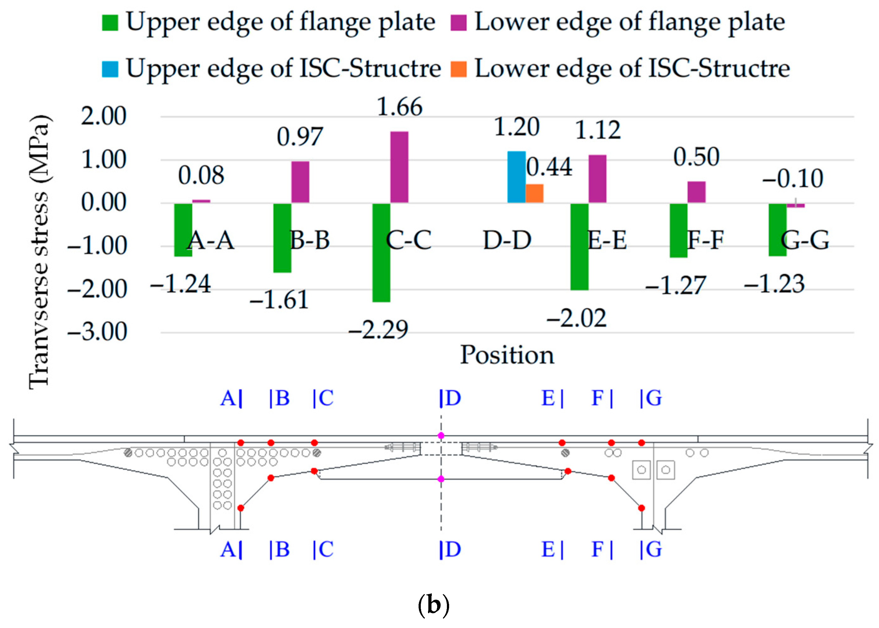 Taking the mid-span section with unfavorable stress as an example, the transverse stress distribution is presented in