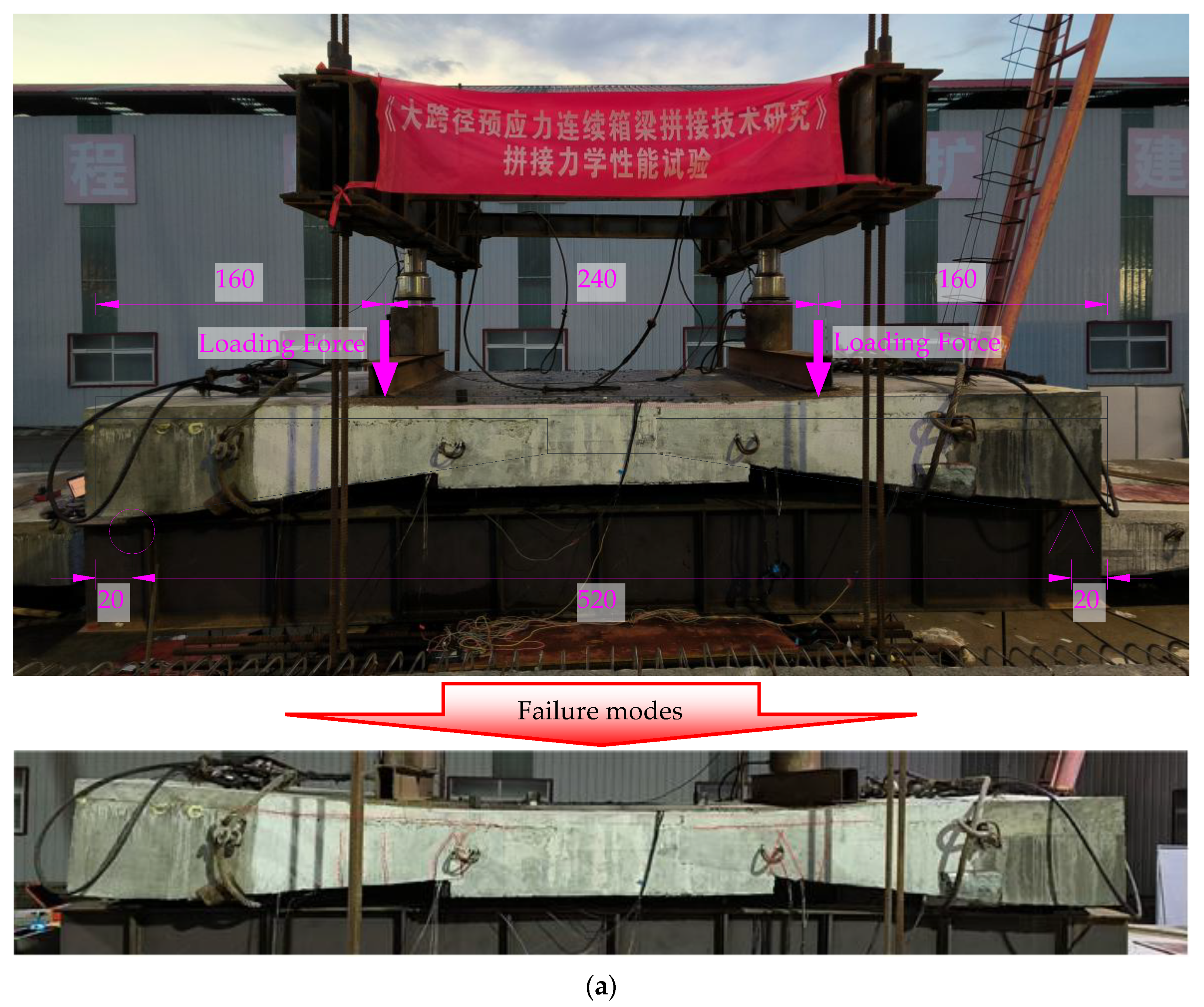 More detailed test schemes and the test and simulation results are available for reference in the published research article, ‘Local Full-Scale Model Test on Mechanical Performance of the Integral Splicing Composite Structure of Adjacent Existing Box Girder Bridges’ [