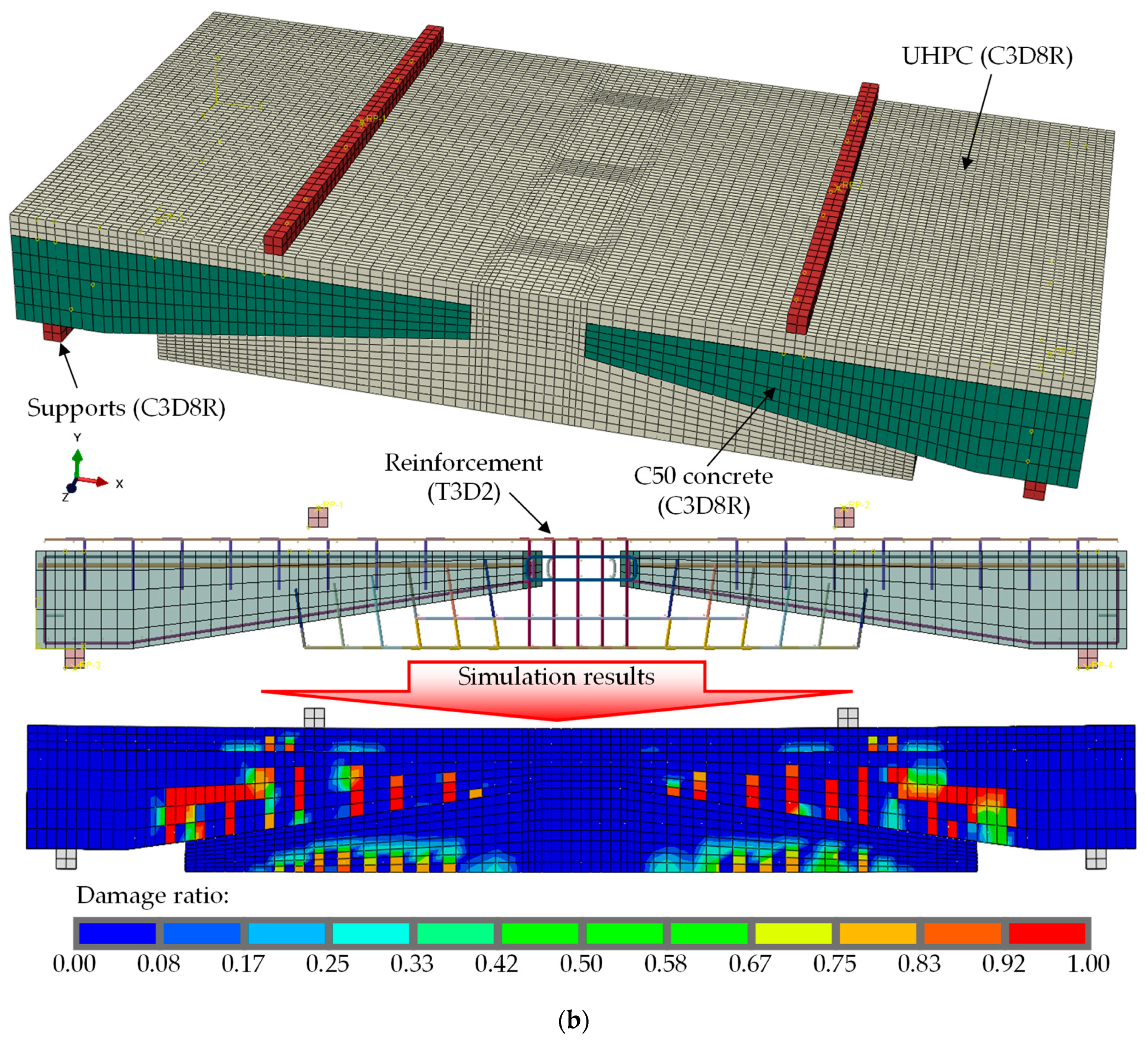 Figure 13b. The simulation model is built in Abaqus 6.14. The solid element of C3D8R is adopted for the concrete and supports, and the beam element of T3D2 is used for the reinforcement and the prestressed wire bundles. The element size is primarily 20 mm. The interaction between the C50 concrete and UHPC is simulated by the surface-based cohesive behavior; the reinforcements and the prestressed wire bundles are embedded in the concrete. The prestress of prestressed wire bundles is applied using the temperature method. After running the simulation model, it can be found that the proposed simulation model can match the test results well and can meet the size optimization requirement of the ISC-Structure.