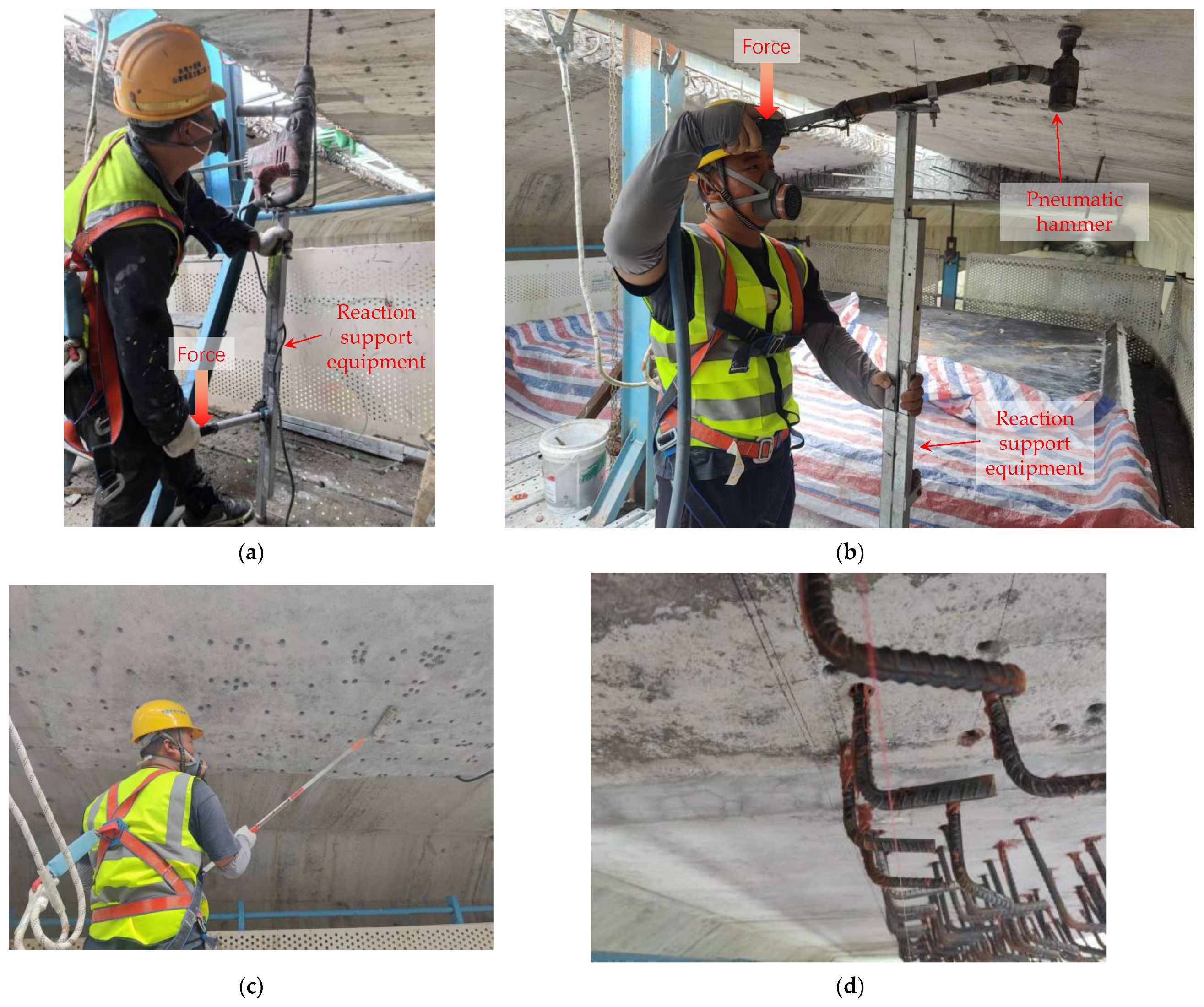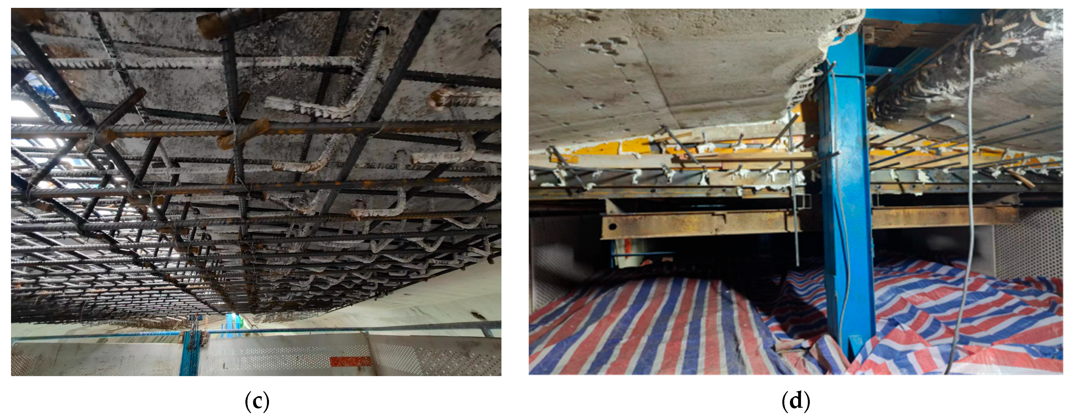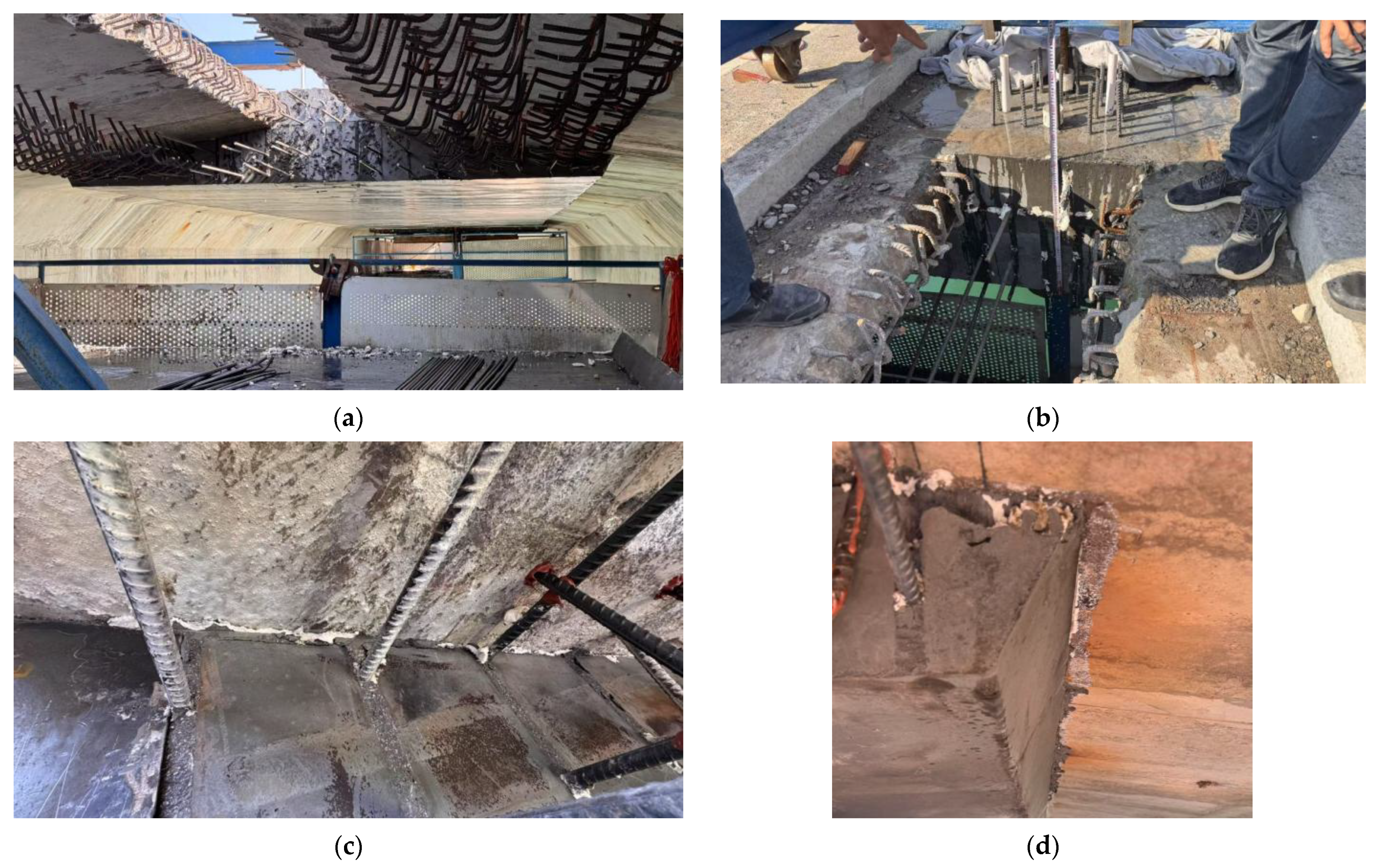Finally, the key technologies of integral splicing construction were studied based on actual site conditions. A layered and segmented construction scheme tailored to the ISC-Structure was formulated. Radar equipment was applied to determine the actual layout of the prestressing wire bundles, and a local concrete chiseling scheme for the flange plate ends was formulated. In addition, a movable construction platform was designed, and reinforcement planting methods were optimized. The reasonable concrete curing duration was also determined using on-site temperature monitoring.