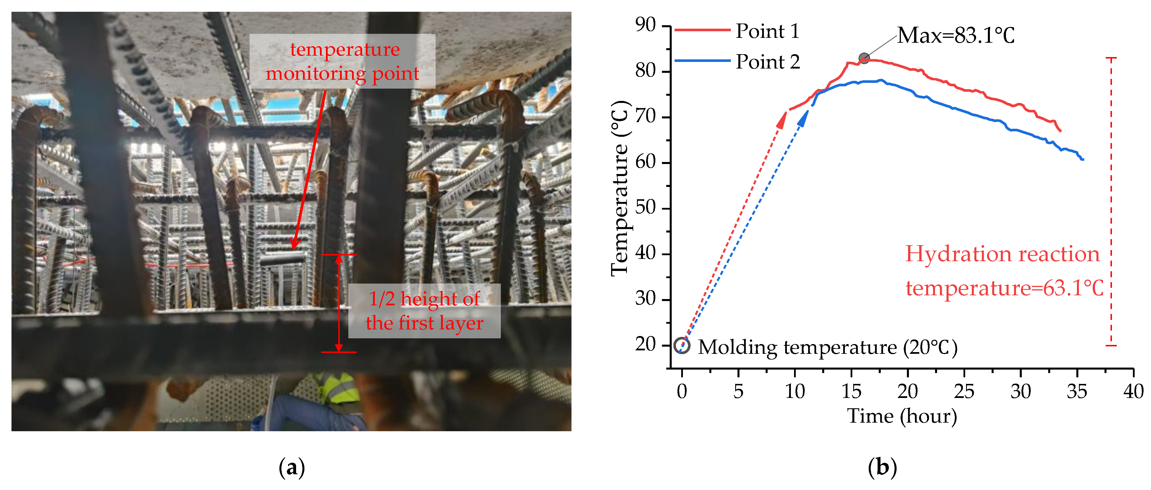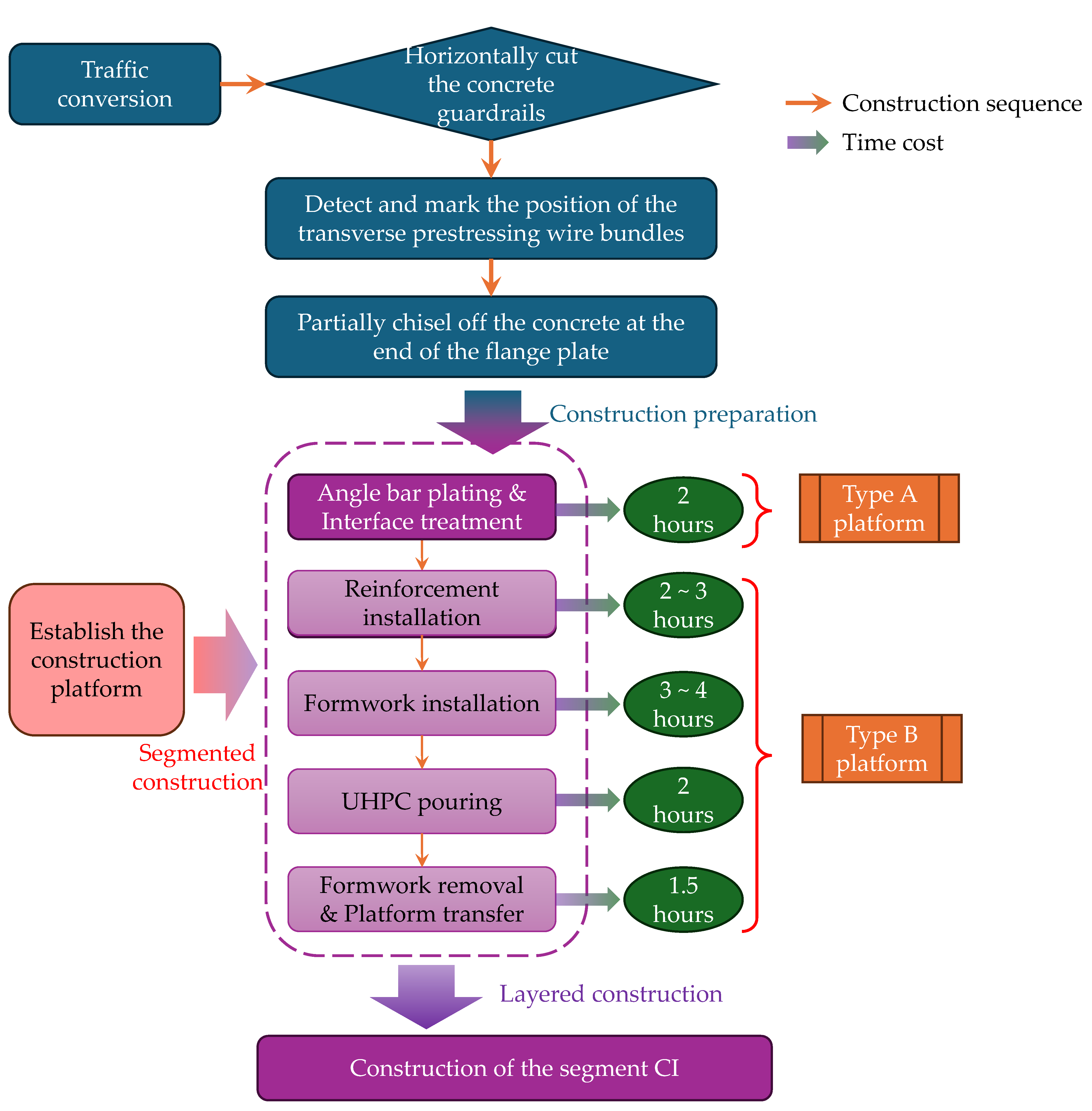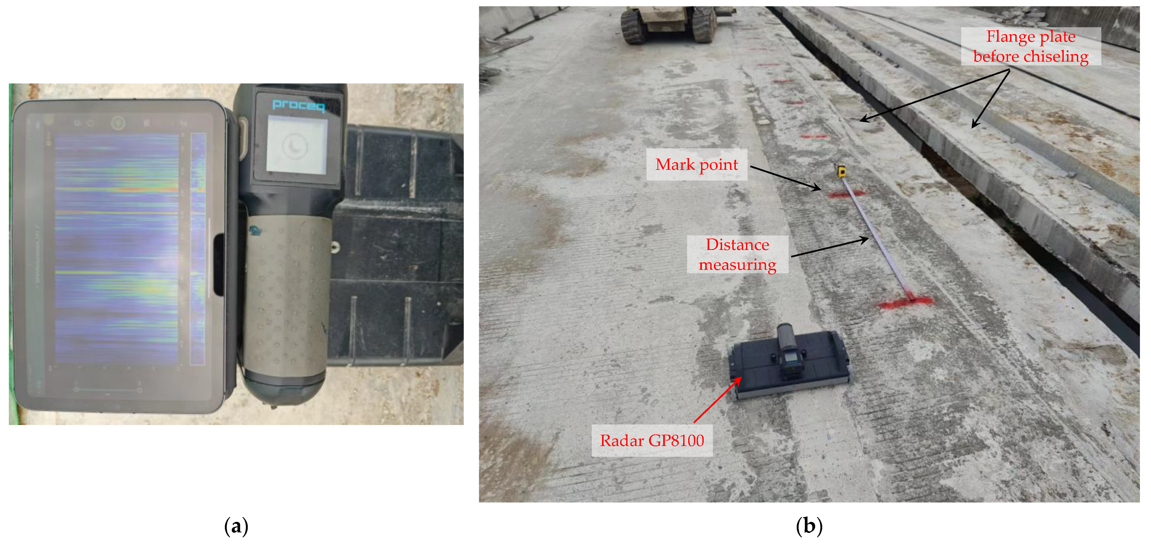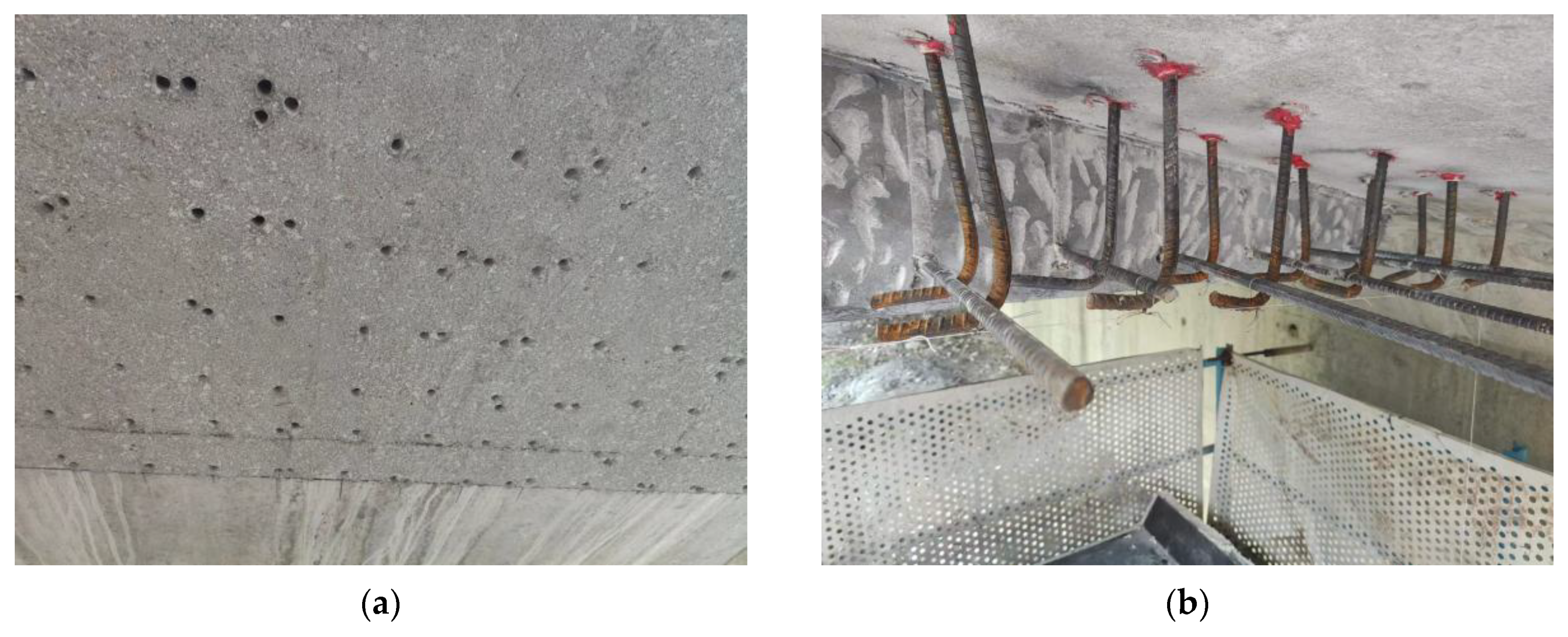 Finally, the key technologies of integral splicing construction were studied based on actual site conditions. A layered and segmented construction scheme tailored to the ISC-Structure was formulated. Radar equipment was applied to determine the actual layout of the prestressing wire bundles, and a local concrete chiseling scheme for the flange plate ends was formulated. In addition, a movable construction platform was designed, and reinforcement planting methods were optimized. The reasonable concrete curing duration was also determined using on-site temperature monitoring.
