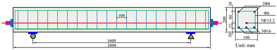 In total, two beam specimens were fabricated and tested in this study. The length, width, and height of the test beam were 2000 mm, 180 mm, and 200 mm, respectively, with the dimensions determined based on the cross-sectional data collected in a previously established database of 630 destructive tests on concrete beams [27]. The lower section of the girder contained a bundle comprising 7ϕs15.2 high-strength prestressed steel strands [28]. The main reinforcements were HRB400 ribbed steel bars, whereas the frame and hoop reinforcements were HPB300 round steel bars [29]. The bottom of the beam was reinforced with three longitudinal tensile bars with a diameter of 16 mm, whereas the top was equipped with two frame bars with a diameter of 8 mm. The hoop bars, which were distributed along the beam span, had a diameter of 6 mm and a spacing of 100 mm. The concrete strength grade was C50, and the protective layer thickness was 30 mm. The specific dimensions and reinforcement details of the specimen are shown in Figure 1. Prestressing was applied to the test beam via the post-tensioning method. The specimen preparation process, including casting and curing, was carried out in accordance with the Chinese standards [30,31,32]. After casting, all beams were cured for 28 days at a temperature of and relative humidity above 95%.