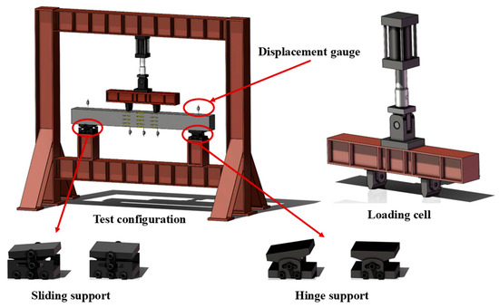 The calculated span of the test beam was 1600 mm, and the length of the midspan pure bending section was 500 mm to ensure bending failure of the test beam. The test was conducted using a microcomputer-controlled electro-hydraulic servo universal testing machine (Shandong Bangce Testing Machine Co., Ltd., Jinan, China) according to GB/T 50152-2012 [31]. A loading frame and a distribution beam were employed to distribute the applied load evenly into two loading points, while two supports were installed at the bottom, thereby forming a standard four-point bending configuration. Specifically, one end was supported by a hinged support and the other end was supported by a sliding support. The schematic illustration of the loading is shown in Figure 2. Strain gauges were attached to the concrete surface to measure strain. Displacement gauges were arranged at the supports on the top of the specimen to measure support displacements, and additional gauges were installed beneath the beam at the loading points and at midspan to record deflection.
