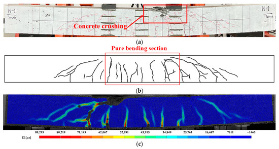 At the initial loading stage, the surface of the test beam had no visible cracks and remained elastic. When the displacement of the beam reached 2 mm, which corresponded to a load of 30 kN, a small crack appeared in the pure bending section. As the load increased, the initial crack propagated, and several new cracks developed at a relatively high crack-propagation rate. When the load reached 160 kN, the beam experienced a significant loss in stiffness, and crack propagation decelerated as the neutral-axis position changed. After the reinforcement yielded, some of the stress originally borne by the reinforcement was transferred to the concrete, thus causing the crack width to increase rapidly. During the subsequent loading, the compressed concrete zone diminished gradually and the compressive stress continued to increase. As the displacement increased, the load–displacement curve started to descend, indicating that the beam had failed, and the loading was stopped. The failure was characterized by crushing of the concrete in the compression zone, observed as blocky spalling, as shown in Figure 3a. The crack distribution during the failure stage of the test beam is shown in Figure 3b. Simultaneously, the principal strain cloud diagram generated from the DIC data at the critical failure stage of the test beam, as shown in Figure 3c, aligned closely with the actual crack distribution.