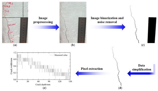 To obtain complete crack information and analyze the variation in the crack width with depth, a ruler was used in the images for calibration. Since the structural measurement plane was kept parallel to the imaging plane, the scaling factor method could be applied, as shown in Equation (2). MATLAB 2023 was used to extract information from the processed images. To improve computational efficiency without compromising accuracy, a 2-pixel interval sampling method was adopted based on its high consistency with the original image, as shown in Figure 4d. The crack width at any depth was calculated using Equation (3). To account for the 2-pixel interval sampling, the width was corrected by a factor of 2 to obtain the actual crack width. The final extracted crack dimensions are presented in Figure 4e.