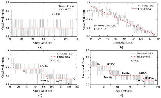 Crack width-depth relationship fitting: (a) equal-width crack; (b) wedge-shaped crack; (c) two-step crack; (d) three-step crack.