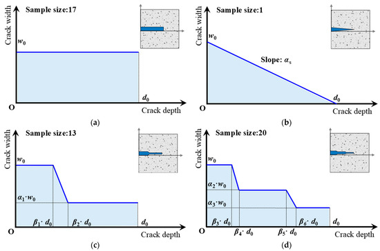 Parametric models and corresponding geometric schematics of typical flexural cracks: (a) equal-width crack; (b) wedge-shaped crack; (c) two-step crack; (d) three-step crack.