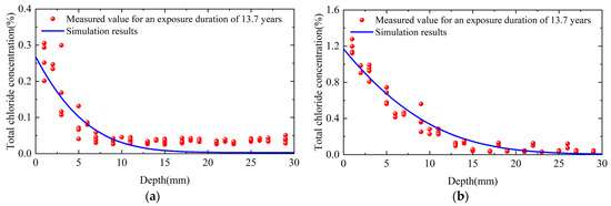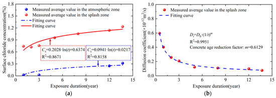 Cubic specimens with 100 mm sides were prepared and placed at the exposure test station in October 2009. Each specimen was coated with epoxy resin on four sides, leaving two opposite faces exposed, and was oriented vertically at the test station. The station consists of four zones corresponding to different marine environments: the atmospheric zone (+6.0 m), the splash zone (+2.0 m), the tidal zone (+0.1 m), and the submerged zone. The details of the exposure test station can be found in the previous study [19]. This study focuses on chloride diffusion in bridge superstructures, with emphasis on specimens from the splash and atmospheric zones. Chloride concentration tests were conducted on splash zone specimens after 1, 2, 3, 5, 8, 12, and 13.7 years of exposure, and on atmospheric zone specimens after 1, 3, 12, and 13.7 years. The testing method was as follows: First, the specimen was ground in layers within a depth range of 0–30 mm. Then, the chloride concentration at different depths was measured using the silver nitrate titration method. Finally, fitting analysis based on Fick’s second law was performed to calculate the surface chloride concentration and the chloride diffusion coefficient. Their time-dependent variations are shown in Figure 7. The concrete age reduction factor was obtained by fitting the diffusion coefficients of the splash zone specimens. Because the same materials were used for the splash zone and atmospheric zone specimens and the age-reduction factor depends on the concrete composition, the result is applicable to the atmospheric zone specimens [36]. After 1-year exposure, the diffusion coefficients in the atmospheric and splash zones were and , respectively. Therefore, the function of the diffusion coefficients was shown in Equation (4).