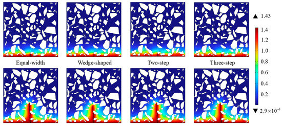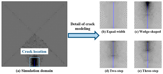 A triangular mesh was employed, with a mesh size of 1 mm in the bulk concrete, whereas a refined mesh with an average size of 0.2 mm was applied near cracks to improve the accuracy of the simulation. Figure 9 illustrates how cracks with different morphologies were modeled in the simulation domain and provides detailed views of the crack regions for each morphology.
