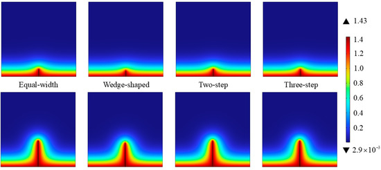 This study assumes that chloride initially diffuses separately in undamaged concrete and crack region. When concentrations were equal at the same depth, two-dimensional diffusion commenced on the crack surface. Cracked concrete was simulated following the method in Section 4.1, with crack geometries based on the four morphologies defined in Section 2.4. The diffusion coefficient in crack region was determined according to Equation (7), with values varying along the depth to match the corresponding crack width at each position.