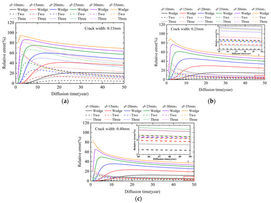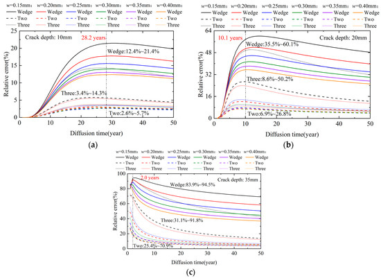 Additionally, the effect of the crack morphology on relative errors was analyzed while keeping the crack depth constant. Figure 12 presents the dynamic variation in relative errors for different crack morphologies at three crack depths. The results show that as crack depth increased, the effect of crack morphology intensified, and the peak relative errors exhibited significant dynamic variation. Further analysis indicated that increasing the crack depth significantly affected the timing of peak relative errors. As the depth increased from 10 to 35 mm, the average time for peak relative errors shifted from 28.2 to 2.0 years. Moreover, the crack depth affected the sensitivity of the diffusion behavior to the crack morphology, with peak relative errors exhibiting a wider range of dynamic variations at greater depths.