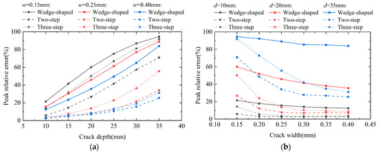 Peak relative errors of different crack morphologies: (a) variation with crack depth at different widths; (b) variation with crack width at different depths.