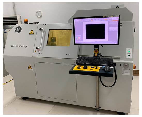 The prototype bridge is a prestressed concrete structure with a 40 mm protective layer, located in a marine environment in northern China; furthermore, this bridge is located close to the exposure test station. To study the effect of crack morphology on rebar corrosion initiation, different crack morphologies obtained from previous studies were applied in numerical simulations. Concrete specimens from the exposure test station were scanned using a GE V|tome|x S micro-CT system (Waygate Technologies, Boston, MA, USA) to capture the actual internal aggregate distribution, owing to the proximity of the bridge to the test station. The scanning device is shown in Figure 15. Scanning was performed with an accelerating voltage of 220 kV, tube current of 200 , and an effective voxel resolution of 71.15 . Prior to scanning, the system was calibrated using the standard geometric and detector calibration procedures provided by the manufacturer to ensure accurate representation of the internal structure. The scan results were binarized, and the aggregate shapes served as the geometric basis for numerical modeling, as shown in Figure 16.