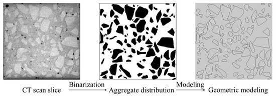Investigating chloride diffusion in cracked concrete from a mesoscopic perspective improves the accuracy of durability assessment. Sun et al. [22] considered concrete as a four-phase composite material and predicted its chloride diffusion coefficient. Peng et al. [23] treated cracked concrete as a five-phase material and investigated the effects of the chloride diffusion zone as well as the width and length of cracks on chloride permeability. Modeling at the mesoscopic scale is crucial, since aggregate geometry and heterogeneity affect chloride transport. Yang et al. [24] revealed that circular aggregates provide more direct and permeable pathways, whereas convex polygonal aggregates lead to more tortuous paths with reduced diffusion. The development of Computed Tomography (CT) scanning technology enables the actual distribution of aggregates to be obtained through scanning and then applied to numerical simulations, thus improving simulation accuracy.