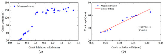 For the simulation conditions, the full-factorial experiment was not applied. The relationship between crack initiation width and depth was analyzed using the crack database. Figure 17a shows that when the crack initiation width , the relationship was approximately linear, whereas for , the increase in crack depth became less significant as the width increased. Since cracks in service bridges are smaller than those in destructive tests, samples with were selected for analysis. The results indicated a significant linear relationship between the crack initiation width and crack depth within this range, as shown in Figure 17b.