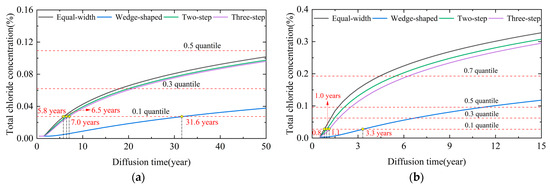 The maximum chloride concentration at a depth of 40 mm was extracted for each condition, and the corrosion initiation time was predicted using the method in Section 5. For the atmospheric zone components, using parameter combination 7 as an example, the corrosion initiation time is shown in Figure 19a. When the chloride concentration threshold was set to the 0.1 quantile value (corresponding to a 90% guarantee rate), the corrosion initiation times for equal-width, two-step, three-step, and wedge-shaped crack models were 5.8, 6.5, 7.0, and 31.6 years, respectively. The difference in initiation time between the wedge-shaped crack and the other three cracks was approximately 29 years. Figure 19b shows the corrosion initiation times for the rebar in the splash zone under parameter combination 7. For equal-width, two-step, three-step, and wedge-shaped crack models, the corrosion initiation times were 0.8, 1.0, 1.1, and 3.3 years, respectively, with a difference of 2.0 years between the wedge-shaped crack and the other three cracks. In both zones, the equal-width model exhibited the highest growth rate, whereas the wedge-shaped model exhibited the slowest. Therefore, as the quantile value increased, the difference between the wedge-shaped crack model and the other models increased. Under identical crack parameters, the corrosion initiation time in the atmospheric zone occurred much later than that in the splash zone.