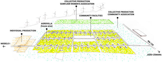 The settlement has a nature reserve area, production plots (individual and collective)—the collective ones belonging to the Sunflower Women’s Association and the Community Association—as well as a nucleus called an agrovilla, with 80 housing plots and spaces for community facilities (Figure 1). The road system is made up of unpaved streets, organized along three main axes: Main Street (which connects Modelo II to the RN-120 road and the neighboring Modelo I settlement), Middle Street, and Final Street. The only existing community facilities are the municipal school, the multi-purpose hall, and the open-air square (Figure 2).