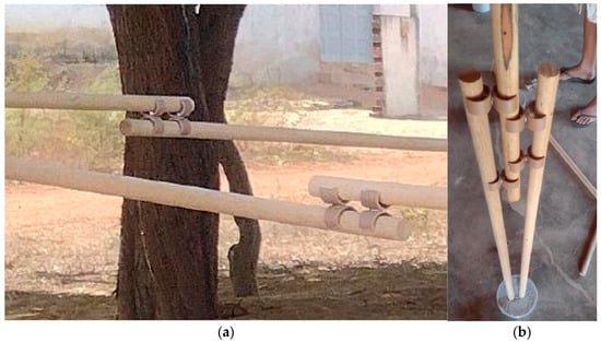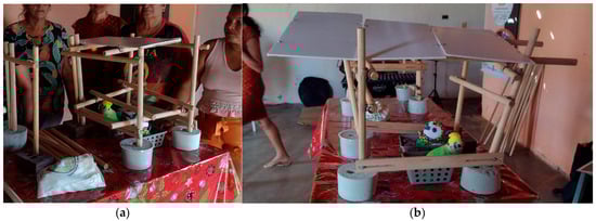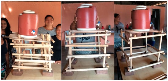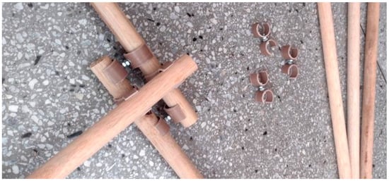 The pre-charrette phase started some days before each workshop. This was the moment that the interface was developed and adapted to help participants design the intended object. The interface started with pieces of wood sticks (50 and 100 cm long, Ø = 2.3 cm), representing 1:5 scale jurema-preta trunks, and connectors in PVC pipe arches (Ø = 2.0 cm), joined with screws, nuts, and washers (Figure 3). This type of connector proved to be more faithful to the real-life connections of round parts with threaded rods than the alternatives tested (such as Velcro strips or eyelets). These parts form the basis of the tool, which was continually improved throughout the workshops, with new components being added according to the needs of the projects—for example, cement foundation parts, wood slabs to support water tanks, stretched fabric, and cardfoam photovoltaic panels (PV) (Figure 4).