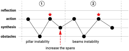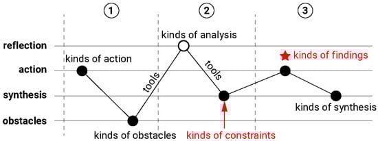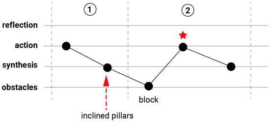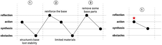 The method was adapted here to deconstruct the design sequence through a timeline (Figure 5) that identifies key moments (black dots) of action (free exploration of the interface), reflection (analysis or planning), and design synthesis (when the solution is consolidated), as well as the obstacles encountered, imposed constraints (red arrows), main findings (red stars), and number of alternatives generated (numbers). The objective of this mapping is to evaluate the interface’s performance in supporting the proposed activities and to understand how constraints influence participation and creativity.