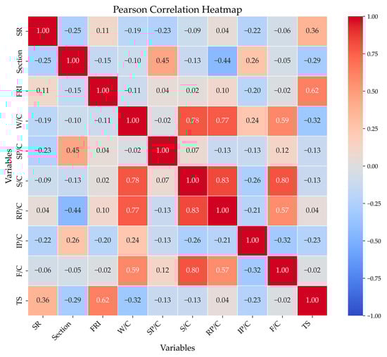 Figure 1 shows Pearson’s correlation coefficient heatmap between the target variable and each feature employed. A positive value in the plot is indicative of a positive correlation, and vice versa, with larger absolute values corresponding to stronger correlations. Alyami et al. [] posited that the correlation coefficient between the variables should be constrained to an absolute value not exceeding 0.8 to circumvent the issue of multicollinearity. As shown in Figure 1, it is demonstrated that the correlation coefficient between RP/C and S/C reaches 0.83. A thorough examination of the raw data reveals that the substantial increase in the relative amount of sand is attributable to the substitution of cement with GGBS and glass powder. The correlation coefficient would decrease if an absolute amount of each input feature is utilized. Nonetheless, in the present study, an objective is to minimize the number of input features for an efficient application. To this end, cement dosage is not considered an independent feature; rather, the ratio of other materials (with the exception of fiber) to the cement dosage is taken as an input feature. As illustrated in Figure 1, the fiber characteristic index, FRI, exhibits the strongest association with the tensile strength of UHPC, with a correlation coefficient of 0.62.