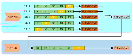 In the training set, the data are randomly partitioned into five folds. Each fold of the validation set contains 28 to 29 samples, with 113 to 114 samples in the remaining training set. Furthermore, the proportion of samples in each box (stratum) in each fold approximates the overall distribution of the training set (20%), with a maximum difference of one sample between boxes. The mean of each fold is employed as the model performance evaluation index of the training set. The efficacy of cross-validation and independent testing is demonstrated in Figure 2. In the figure, green represents the training samples, yellow denotes the validation (test) samples, while the R2, RMSE, and MAE values within the chocolate, light gray, and sand brown boxes represent the per-fold validation value, the 5-fold average validation value, and the test value, respectively.