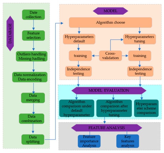 In order to prevent the adverse effects of the skewed distribution of the sample target variables, this study employs a method of equal-frequency stratified sampling to divide the data into the training set and the test set. According to the findings of previous research conducted by the authors’ team on the sensitivity of the database division ratios of training-to-testing sets of ML models [], the training set utilizes 80% of the data, while the testing set employs the remaining 20% of the data. The sample data in the testing set are not involved in training and are exclusively used for the evaluation of model performance.