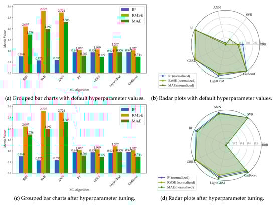 - The quantitative evaluation of seven ML algorithms reveals that, under default hyperparameter settings, ensemble algorithms such as RF, GBRT, LightGBM, and CatBoost exhibit superior prediction performance, as indicated by an R2 value > 0.92. Conversely, traditional ML algorithms, including BRT, SVR, and ANN, demonstrate a comparatively inferior model performance. After hyperparameter tuning, the model performance of ensemble algorithms exhibits only a marginal improvement. In contrast, the conventional ML algorithms, including SVR and ANN, have shown substantial progress, attaining a model performance that is comparable to that of ensemble models. With regard to the R2 value, the performance enhancements for RF, GBRT, LightGBM, CatBoost, ANN, and SVR after hyperparameter tuning are 0.43%, 1.28%, 2.06%, 0.21%, 58.82%, and 66.67%, respectively. Both conventional and ensemble models with hyperparameter tuning consistently achieve R2 values greater than 0.94. However, the BRR algorithm demonstrates a suboptimal performance, irrespective of the application of hyperparameter tuning.