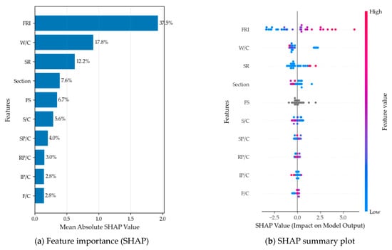 Despite their ability to provide highly precise predictions, the “black box” nature of ML models significantly restricts their application in engineering field. In response to the inherent nature of ML models, interpretability methods such as SHapley Additive exPlanations (SHAP) have been widely adopted in recent years [,,,,]. The SHAP framework utilizes quantitative methods to identify the key factors influencing the mechanical properties of concrete through additive feature attribution methods, thereby providing intuitive model interpretations.