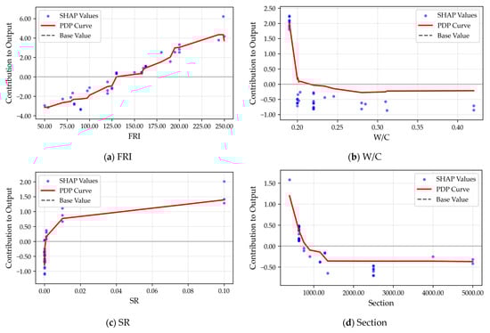 Furthermore, SHAP can be utilized to detect nonlinear responses by combining it with PDP to illustrate the relationship curve between the target feature and the SHAP value. The current study investigates the relationships between the primary features (namely, fiber reinforcement index, water–cement ratio, strain rate, and specimen cross-section area) and the tensile strength of UHPC, with a focus on distinguishing the specific impact of each feature.