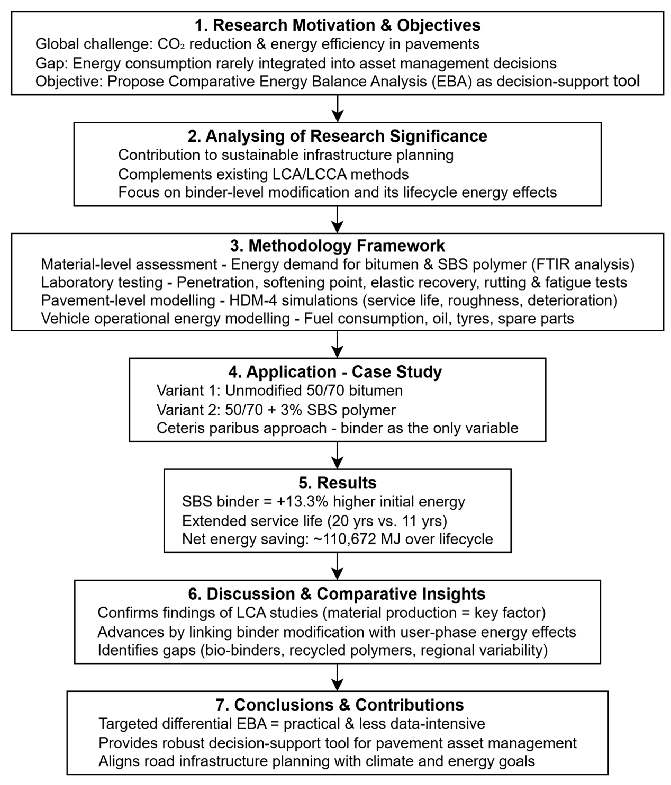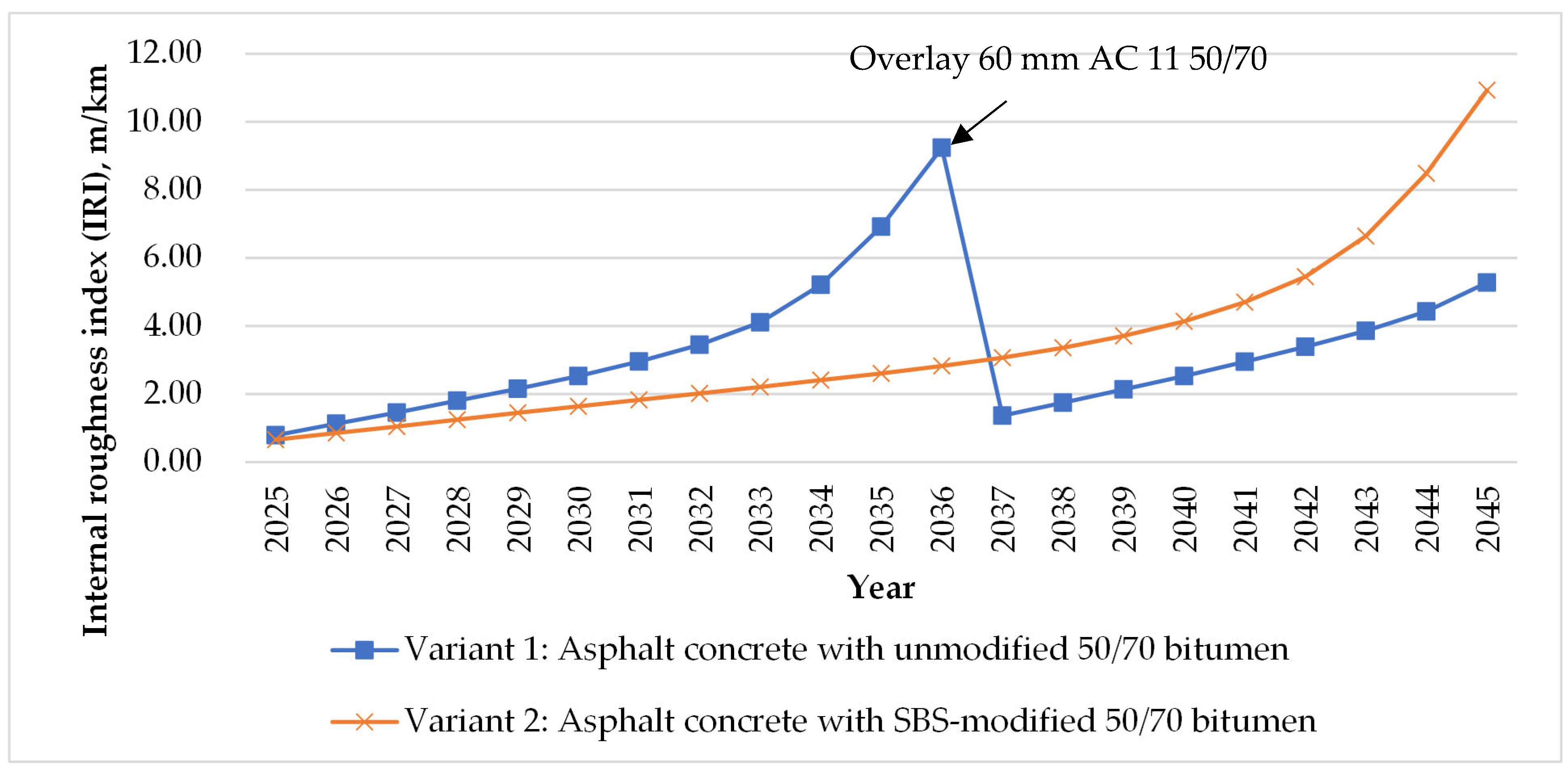 This chapter evaluates the impact of binder modification on pavement performance and the associated energy consumption of the vehicle fleet. The performance of both evaluated variants is assessed over a 20-year analysis period (2025–2045), based on mechanistic design and performance prediction using the HDM-4 framework. Both pavement variants are subjected to identical traffic and environmental conditions. The average annual daily traffic (AADT) is 6894 vehicles, with a composition of 4167 passenger cars and 2182 heavy articulated trucks. The remaining vehicles include vans, buses, and medium commercial vehicles. A compound annual traffic growth rate of 1.5% was applied to passenger cars and 1.0% to the remaining vehicle classes, based on regional forecasts. The cumulative traffic loading was converted to equivalent standard axle loads (ESALs) for the bearing capacity evaluation.