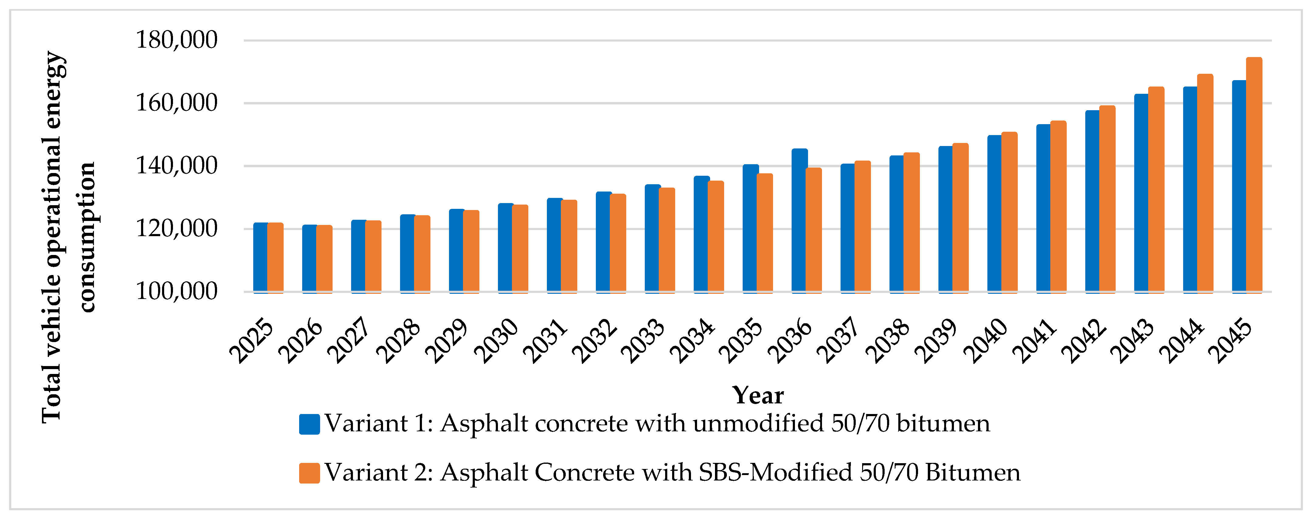 The results clearly reflect the dynamic relationship between pavement performance and energy demand. As pavement surface condition deteriorates—most notably through increasing roughness and deformation—vehicle rolling resistance and fuel consumption rise accordingly, leading to higher operational energy use. This trend is particularly evident in Variant 1, where the progressive deterioration of the unmodified pavement culminates in a marked increase in energy consumption prior to rehabilitation in 2037. Following the overlay intervention, pavement roughness is restored to near-initial levels, resulting in an immediate and observable reduction in vehicle energy demand. In contrast, Variant 2, which incorporates the SBS-modified binder, maintains lower operational energy consumption during the initial years due to its superior fatigue resistance and slower deterioration. However, in the later years of the analysis period—particularly after 2037—its energy consumption exceeds that of Variant 1, which benefits from restored pavement condition following rehabilitation.