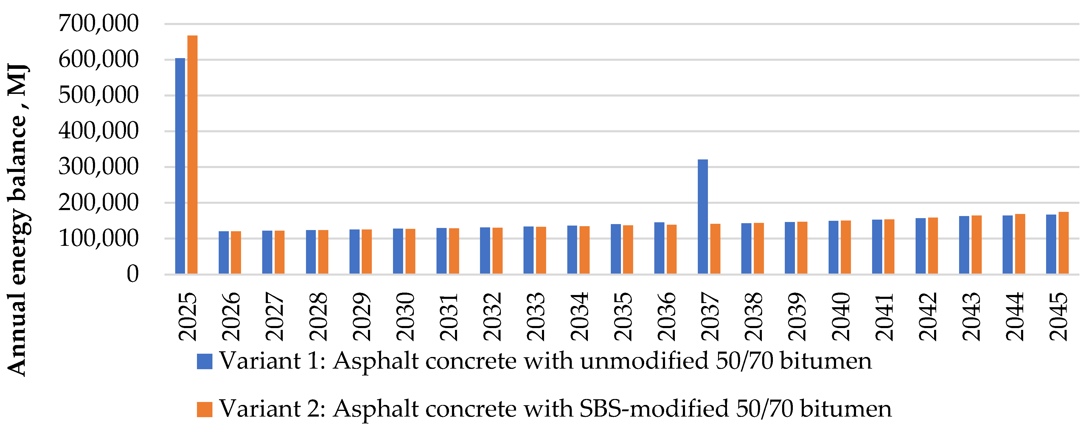 Figure 7 present the annual energy demand for each variant, segmented into initial construction (binder-related energy), operational energy (vehicle fleet consumption), and—where applicable—rehabilitation energy. For Variant 1, the energy demand includes both the binder energy in the original pavement layer (482,171.44 MJ in the year of its construction, 2025) and the binder energy associated with the 60 mm asphalt overlay applied during rehabilitation in 2037 (180,809.90 MJ). Variant 2 includes only the initial binder energy (546,168.74 MJ in the year of its construction, 2025), as no rehabilitation is required within the analysis horizon.