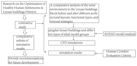 CFD simulation software is widely used in the assessment of courtyard wind environments []. Research on wind environments in traditional historic districts typically evaluates the wind environment of a district based on two different wind directions in winter and summer. Generally, these studies combine airflow characteristics with wind comfort standards and local wind statistics to assess wind comfort. In this study, a CFD simulation approach is used to assess and study the wind environment of the Liyuan in the historical district of Dabaodao, Qingdao, employing LES (Large Eddy Simulation) to simulate the air flow field conditions. The corresponding control equations and a turbulence model were established based on fundamental physical laws such as mass conservation, momentum conservation, and energy conservation. The computational domain size was set to 100 m, with a boundary condition computational domain model range of 100 m, a calculation domain resolution of 0.3 m, an inlet turbulence intensity of 10%, and a reference height of 1.5 m, which determined the simulation’s spatial range. Both wind direction and reference wind speed were based on local meteorological data from Qingdao. Based on the simulation trial calculation, the number of iterations was 255. The research framework of this study is depicted in Figure 1.