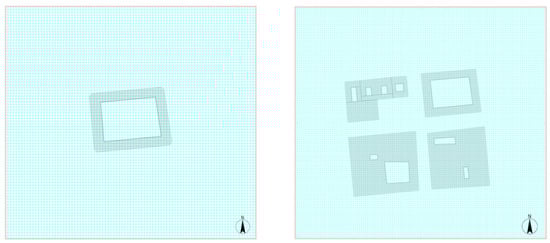 The selected architectural models are representative of the spatial form and building layout observed in the courtyard district survey. A single courtyard is defined as a building that is separated by small and medium-sized streets and serves as the only enclosing structure separating the public space of the street from the private courtyard. A courtyard cluster is defined as a group of buildings separated by small and medium-sized streets. A courtyard neighborhood is defined as an area enclosed and separated by the city’s main and secondary roads. According to the three different spatial scales—single courtyards, courtyard clusters, and surrounding neighborhoods—separate models were established for courtyard buildings and courtyard neighborhoods (Figure 2). For single-building structures, only the main building portion enclosed by the street and courtyard has been retained, as shown in the figure. The dimensions of the main building of the square-shaped structure are 60 m (length) × 45 m (width) × 8 m (height). Since the height of the decorative items and plants in the courtyard is less than 1.5 m, their impact on pedestrian height is negligible and can be ignored. The outdoor toilet is small, so its impact on wind speed is insignificant and can also be omitted. The models were converted to STL format for wind environment simulation, yielding wind environment simulation results at a height of 1.5 m above ground level for pedestrians [].