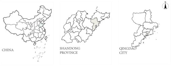 Qingdao is located in the southern part of the Shandong Peninsula, between 119°30′–121°00′ E longitude and 35°35′–37°09′ N latitude, surrounded by the sea on three sides and backed by mountains on one side (Figure 3). As a coastal hilly city, Qingdao features a terrain that is higher in the east and lower in the west, with undulations on both the northern and southern sides. Most of the traditional Liyuan in Qingdao are constructed in accordance with this terrain, generally parallel to the streets. Their external contours are determined by the direction of urban streets, typically square in shape, enclosed on all four sides, and forming a large courtyard in the center. These Liyuan are distributed in an orderly manner according to the terrain, exhibiting diversity in size, height, and form. This study selects Liyuan buildings of different types in the Dabaodao block, including single courtyards and courtyard clusters, as research objects to conduct CFD wind environment simulations.