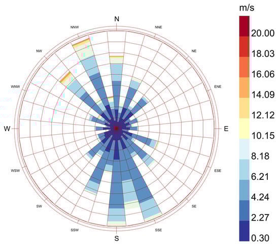 This study utilizes long-term local meteorological data. Based on the wind rose diagram of Qingdao, it is concluded that, as a typical coastal mountainous city, Qingdao has a north temperate monsoon climate with a relatively high annual average wind speed of 4.6 m/s. The prevailing wind in winter is the northeast wind, with an average speed of 3.67 m/s and a maximum speed of 5.2 m/s; the prevailing wind in summer is the south wind, with an average speed of 5.2 m/s and a maximum speed of 6.0 m/s. For the simulation in this study, the summer prevailing south wind with a speed of 5.2 m/s is adopted (Figure 4).