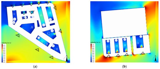 (a) Wind speed cloud map at 1.5 m above ground level in Junyeli. (b) Wind speed cloud map at 1.5 m above ground level in Yuxingli. (△ represents the entrance to the courtyard, ● represents the location of the toilet, A–C and ①–⑩ are the corresponding yard designations in the article).