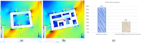(a) Wind speed cloud map at a height of 1.5 m above ground level for courtyards primarily used for commercial purposes. (b) Wind speed cloud map at a height of 1.5 m above ground level for residential courtyards. (c) Comfort Zone Comparison.