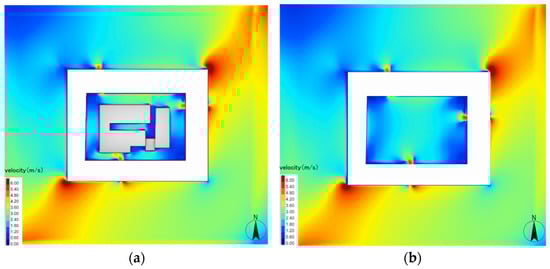 (a) Wind speed cloud map of the courtyard building 1.5 m above ground level before the update. (b) Wind speed cloud map of the courtyard building 1.5 m above ground level after the update.